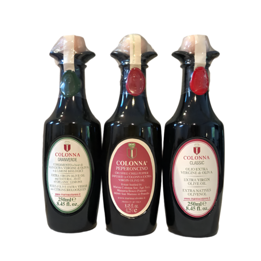 A gift box containing three best selling olive oils from Marina Colonna: The classic house extra virgin olive oil, the granverde lemon oil and peperoncino oil.